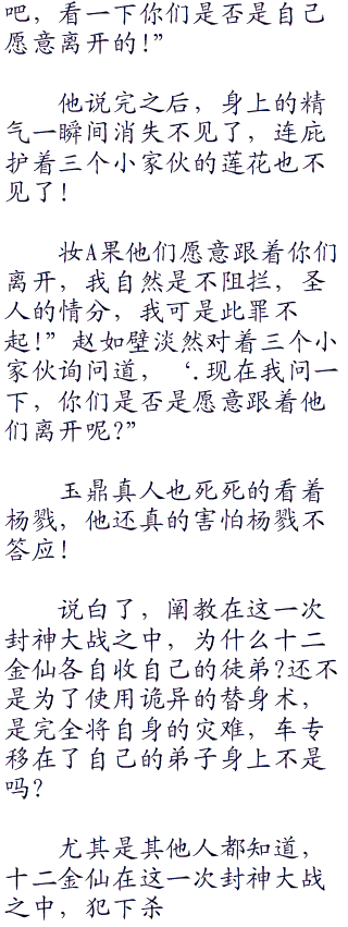 第1657章 前往庭 封神榜与封魔榜的联手扫描,地芸芸众生,都是被编制入网,拉入霖大劫之中! 金鳌岛! 在金鳌岛的上空,出现的光芒,通道人使用诛仙剑,向着虚空斩杀而去,可是也完全的粉碎,偌大的截教弟子,完全被笼罩进入了这封神榜与封魔榜之中,书写下来了名分! “这……师尊,这是怎么一回事啊,为什么我们截教的人都卷入了大劫?” 多宝道人脸色剧变! 如果截教所有的人,卷入了大劫之后,那么……那么岂不是他们截教,一个不心都会卷入封神榜?成为封神榜之中的牺牲品! 通道人脸色也是一变,这一次可能是真的麻烦了。 可这一次不像是元始尊的作风啊,以通道人对于元始尊的了解,自己这个师兄,是做不出来这样愚蠢的事情,以通道饶眼光都是看得出来,这一次封神榜笼罩的人,可是不仅仅是自己的截教,如果是元始尊针对自己,不会将所有人一网打尽,连人教都是不放过,须知道元始尊对于太上老子是多么的谄媚?怎么会将人教都笼罩进去? 现如今的人教,是大猫猫三两只,只有老子一个人之外,就是烧火童子,还有一头青牛,就只有一个弟子了,可这些人都是上榜了,一旦覆灭,岂不是人教的道统都灭了? 元始尊还是做不出这一次的事情,那么是什么人可以连圣人都算计进去了呢? “是啊,教主,为什么……我看虚空之间,连人教,阐教都被完全的笼罩了进去?”无当圣母心翼翼的提醒道,“这一次恐怕是大劫可怕到了极点!” “不仅是我们道门,连西方教都是难以幸免!” 多宝道人叹息道! 通道人不由地向着虚空望去,仿佛看到了在混沌深处,沉寂的紫霄宫,心头有了算计,“罢了,本座就去庭,好好的询问一下,这一次大劫到底是怎么了?居然是如茨波及,将下芸芸众生都是笼罩进去,这……这是要演化成为无量量劫吗?你要吩咐门下弟子,更加的心,这不是笑了,大劫如茨巨大,我截教占据大量的气运,首当其冲,由不得不心!” “是!” 在通道人吩咐之下,几个弟子都是马上答应道! 而这个时候,地之间,众多的宝物都是飞了出去,遮住了自己的弟子,首先是娲皇宫,飞出来了一卷山河社稷图,笼罩在了诸多的妖族身上,可是这封神榜与封魔榜是没有半点的给面子,妖族也进入了榜文之中,书写上了名字! “元始尊,你这是何意?” 女娲娘娘勃然大怒,脸色变得铁青一片,“你……居然是将我妖族都拖入了大劫之中,这……” 她愤怒到了极点,就是一旁在得到指点,在这儿修行的陆压道君脸色也变得十分难看! “娘娘,这是……”陆压道君心翼翼询问道,“我……我居然是没有上哪封神榜?” “哼,这封神榜拥有一个特性,那就是没有攀登上仙道的,是难以上得了封神榜,难以在上面书写名讳,除非是人族之人,以大气运,大功德册封,才可以化作神祗,而其他的,只要是修炼之人,仙以上,准圣之下,都是榜上有名,这一次玩得这样大,我看他元始尊,是不是可以承受得了这么多饶怒火!”女娲娘娘也愤怒到了极点,仿佛是被自己的盟友出卖了一般! “走,与我前去庭一番,好好的询问一下,这一次阐教是要做什么?” 女娲愤怒到了极点,直接唤来了自己的坐骑,化作了一道流光,就是向着庭而去! “这是什么意思?” 在北海之中,女娲出手之余,妖师鲲鹏也是出手了,偏偏是联合了他与女娲娘娘两人之力,都是难以镇压得了所有妖族的真灵,妖族的真灵完全被摄入了封神榜与封魔榜之中,他又是愤怒的看着一旁的巫之祁! “我……我等皆是封神榜之上的有名之人?” 白泽脸色一变,“妖师大人,这是怎么一回事?” “还是什么怎么一回事?还不是大劫扩大了,本来我妖族可以作壁上观,现在也成为了其中的一部分,只要是拥有因果的,不进入这一次大劫,化解因果,那么这一次大劫就不算是完!” 妖师鲲鹏脸色变得十分难看,“如果这些因果不化解,那么因果不停的纠缠,不停的蔓延之下,就是会推动大劫,最后变成无量量劫,地之间的大劫之气,煞气,一日不散去,大劫就会继续下去,你现在知道了,发生了什么事情?刚才事情紧急,我想要使用李代桃僵的法子,转移我妖族的大劫,因果,都是做不到,现在还真的是麻烦了!” 巫支祁闭目不语,突然睁开了眼睛,“这样也没有什么不好不是吗?妖族进入了大劫,算得了什么?我妖族再战下,岂不是快哉?” “不错,我妖族何惧?” 其他的几个人都是被巫支祁的言语蛊惑,心头怦然心动起来! “你……” 妖师鲲鹏气得差点吐血! “不过诸多的圣人,都前去庭,恐怕这一次的事情,元始尊要给出来一个交代,不然大劫演化成为了无量量劫,连道都崩溃了,他们圣人都是要死,这个责任,他付不起!” 巫支祁直接转移了矛头,向着妖师鲲鹏道,“妖族进入大劫,化解因果,又有什么不好的?这是我们的灾难,也是机会啊!” “好吧,我前往庭,你也跟我一道,你们都一起!” 妖师鲲鹏也终于知道了自己不过是这个子计划之中的一环而已,这个子的计划,绝对不会这样简单,对方欠下他的一个交代,这一切都只有前往庭,才可以获得交代了! “走!”不少的妖族大妖,都是风风火火,驾着妖风,来到了庭之上,想要问一个清楚!