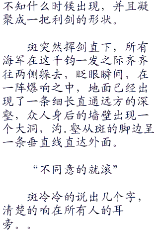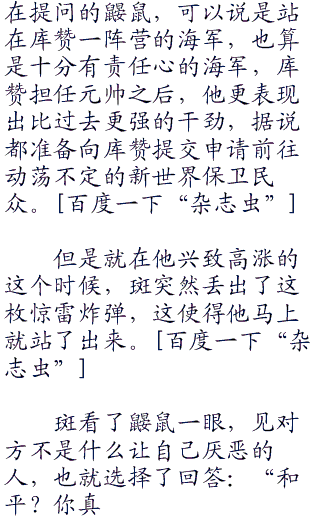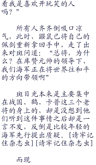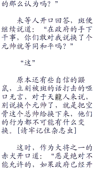 斑说出这句话之后,全场一片哗然,连中将鼹鼠手持的太刀都一下在愣神之中手一松,使太刀掉到了地上,发出“砰”的一落地轻响声,但是现在没有人管这个,鼹鼠也是傻愣愣的看着前方的斑,久久未能说出什么,也没有意识到自己的剑掉在了地上。