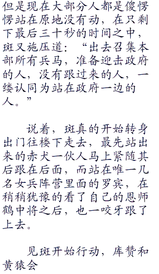 斑一下子就把事情推到了死角之中,显得完全没有回旋的余地,态度摆的很清晰,就算我一个人我也要干,你们想帮政府就立刻从这里滚出去。