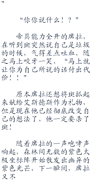当所有人只看到自己的眼前闪过一抹紫色之后,席拉就突然消失在原地,出现在了斑的身后,而娜杰塔一眼看出其问题的所在,目光凝视在席拉左手紧握住的那仪器上面,心里暗道:“那就是,他的帝具吗?”