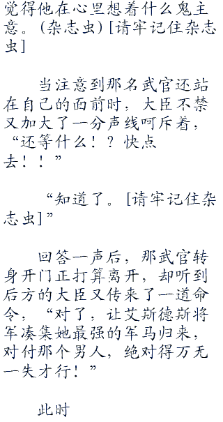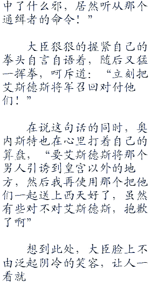 大臣的脸上皱拧成了一团,接二连三的把桌上的盘子一一打碎来宣誓自己的不满,最后脸上的皱纹又扭成了一团,狠狠看向眼前的武将,怒声道:“传书!让艾斯德斯将军回来!!”