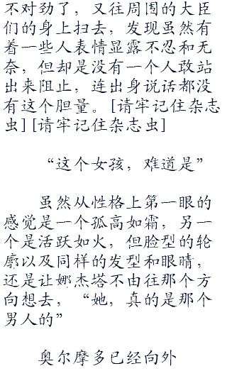走在娜杰塔前面的奥尔摩多,再度往前走去,最后站在了王座下左侧的位置,有着一股一人之下万人之上的气势,而他所站的位置,也可以说是百官之首了,这一切都归功于他走了