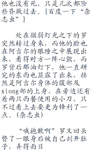 乍看之下,这是很血腥的场景,但是只要打开灯一看,就会发现,即便被分尸成一段一段的,阿吉尔的身体断接处仍旧没有一滴鲜血流出,之上显得漆黑,仿佛被什么东西填补起来,如果在仔细看看,就会发现,阿吉尔占据上半身大部分器官的腹部和xiong部不见了。