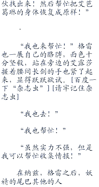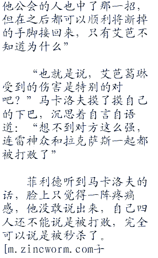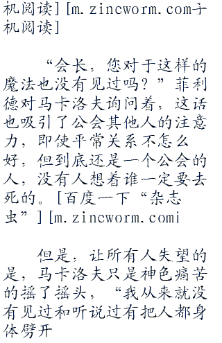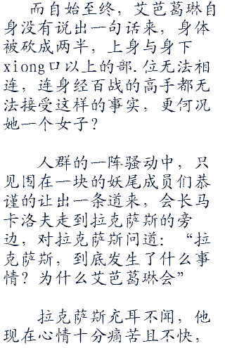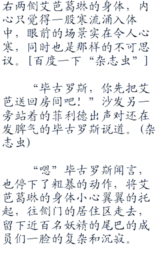 玛格若利亚,妖精的尾巴公会中,所有人目瞪口呆的围成一团,看着中间上下.半身被菲利德和毕古罗斯抬着相接的艾芭葛琳,但无论试了多少次,艾芭葛琳的身体还是处于一上一下的断裂身体,但人却没有死,但面冷如灰,也和死了几乎没有什么区别。