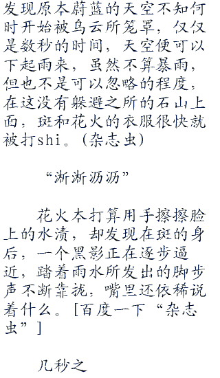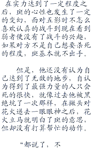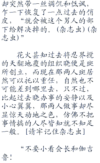 斑在心中冒出如此想法,细想起来,他和花火的关系确实有点微妙,兄妹,不可能,父女,怎么说都觉得奇怪,要说“同伴”的话,也确实勉强可以挂一点钩,不过硬要解释的话,恐怕还是以“忘年之交”这种称呼比较合适。
