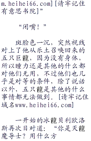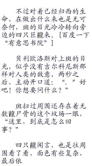 一只浑身泛白,双手手肘处有着一对肉翅,一对如剑齿般的虎牙立与上牙出探出,虽然已经没有身体的温度,但隐隐约约还是让人感到它身上散发出来的阵阵寒气,只听这只银白龍目对斑说道:“吾名贝利欧洛斯,为冰原之龍,就是你把我们召唤回这个世界的吧?”