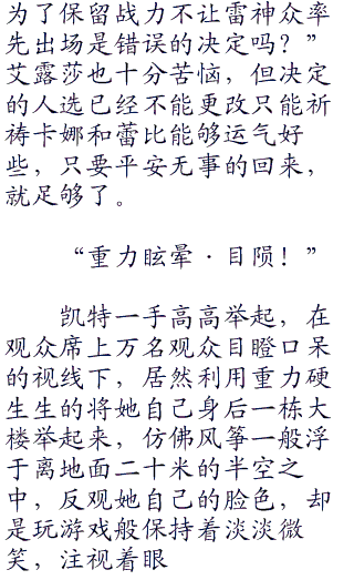 在翡翠公主宣布完复赛的比赛规则之后,随着裁判员的一声开始,竞技场成以万记的观众一下爆发出了巨大的欢呼声,更是将城市里的大部分人吸引了过去,就算未得到入场的资格,居民们都会在城市各处的投影仪上观看现场转播。
