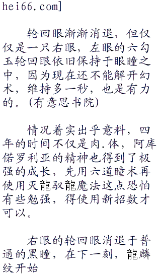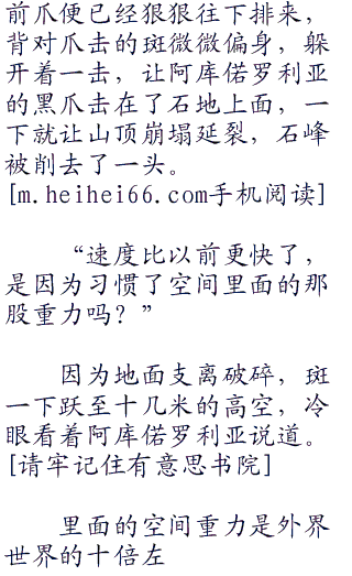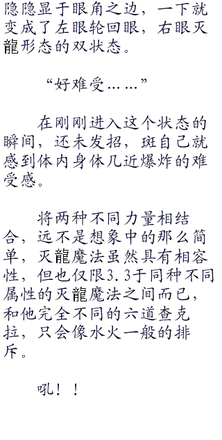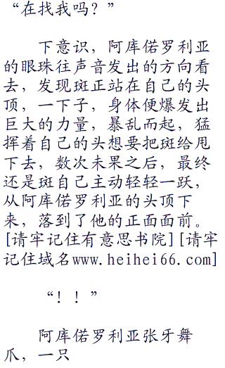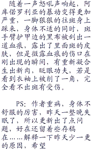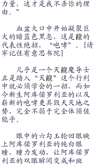 巨大布满蓝黑鳞片的翅膀缓缓煽动,产生的强烈暴风如空气刀将四周巨大的石块给一分为二,下一瞬,阿库偌罗利亚猛意识到自己被从那个景色一成不变的古怪世界中释放出来了,但这次出现他不是疯了一样的哇哇大叫,而是下意识的环绕四周,寻找着斑的所在位置,因为他知道,是那个人把自己放出来的。