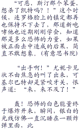 斯汀银白的超大竖光从他张开的口中激射而出,对着凯特冲了过去,强烈的光芒几乎要冲破夜晚的黑暗,无法与之对视,这道新咆哮的力量倾注了斯汀十成的力量,速度也是难以想象的快,如同激光,眨眼已经抵达凯特近在咫尺的面前。