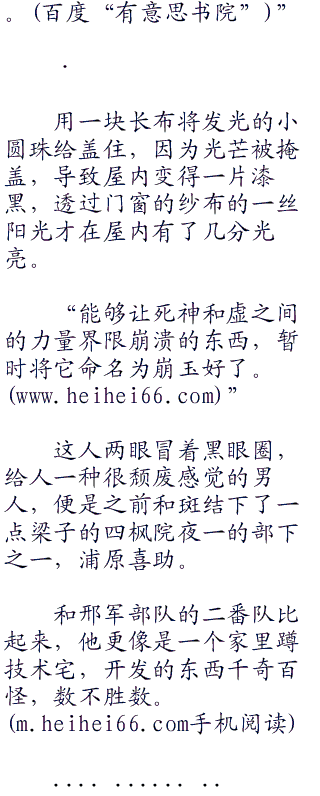 斑凝目一看,发现在一团几乎已经生成实质的白烟之中,一个小拇指般大小的黑球正静静的躺在蓝染掌心的那阵白烟之中,似乎这个东西还未能完成,目前还看不出什么特别的地方来。
