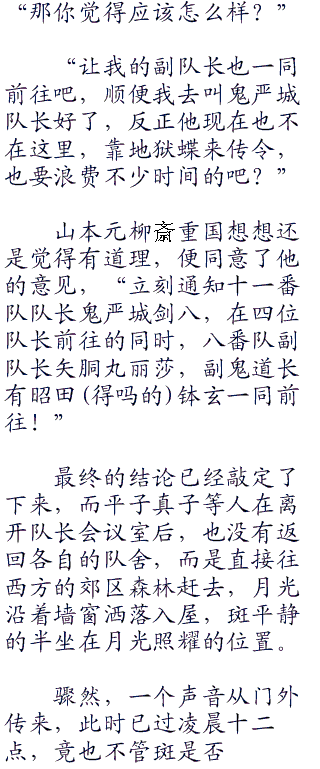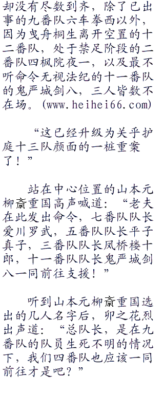 率领着这支队伍的人便是九番队队长六车拳西,根据山本元柳斎重国亲自下达的命令,前来调查近日流魂街的魂魄失踪事件,一开始这件事情本是由二番队的邢军负责管理,但是随着事态的进一步恶化,已经不得不增派人手了。