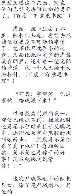 反膜,这种东西是大虚用来拯救自己同伴,所使用的一种相当别致的空间移动术,如果不是拥有着隔空的能力,基本要攻击到里面的事物,是不可能的事情,即便是破坏力最强的斩魄刀,流刃若火也是一样。