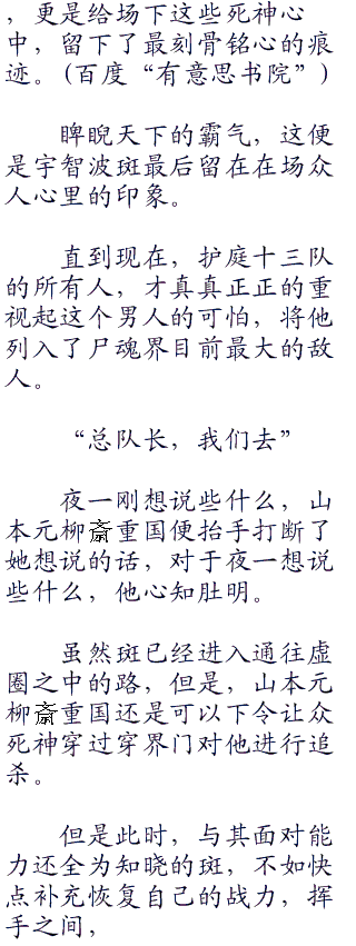 自知这一点的山本元柳斎重国,慢慢把刀收回刀鞘之中,也因刀收回的“啪”的一声轻响,数十根大火柱也在这一瞬间熄灭,再强制进行攻击,只是将这片森林完全毁灭而已,没有一丝益处。