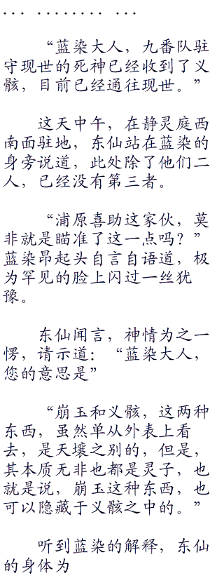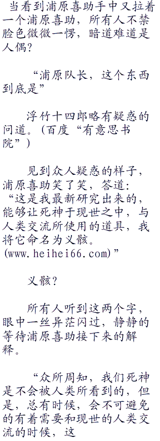 浦原喜助夸张的笑了两声,突然不知道从那里,掏出一个一模一样的“自己”来,不过这个他一动不动,看起来就仿佛是一个尸体一般。