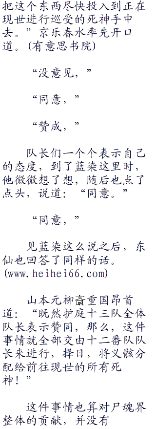 “哦浦原队长这次居然没有迟到,真是难得啊”京乐春水看着山本元柳斎重国身边的浦原喜助笑笑道,没有讽刺的味道,仅仅是开玩笑。