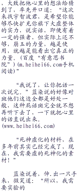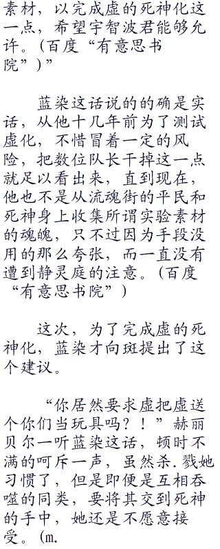 赫丽贝尔出声问道,要说和现世中,和那些死神接触最多的,无意就是虚了,所以赫丽贝尔推测蓝染来这里的原因,是蓝染想要利用斑,以及旗下虚的力量,去帮他找崩玉。
