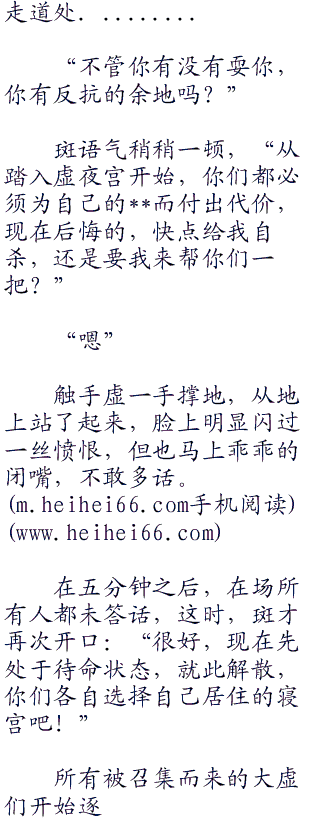 斑在走进主王殿之后,微微偏头对身后的妮露说道:“叫你的部“一三七”下留在外面,里面只有有资格的人,才能够进入。”