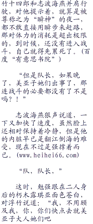 大约几公里远的地方,三个黑影正在以他们濒临极限的速度进行着冲.刺,佩戴副队长标识的志波海燕更是心急如焚的冲在最前面。