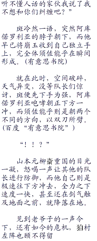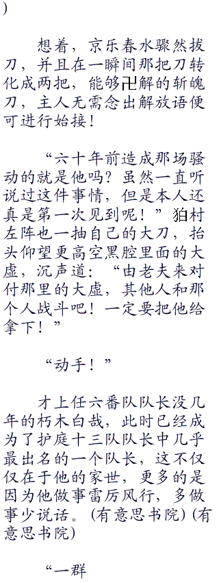 山本元柳斎重国说话的期间,空中的其他方位也陆陆续续闪现出众多残影,其中尽是队长或副队长,当看到阿库偌罗利亚那狰狞的面孔时,无不露出一丝惊讶,但马上皆露出严阵以待的表情。