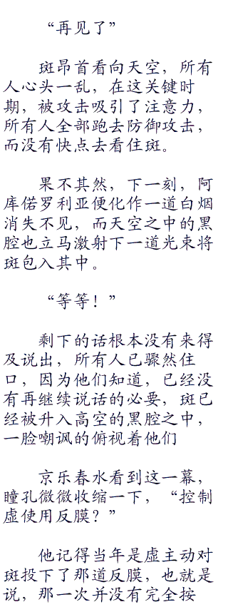 斑伸手打了个响指,一声“啪!”的脆响下,突然空中传来一阵涌动,发出仿佛是鸣钟一般的幽响,但同时也显得甚为诡异。