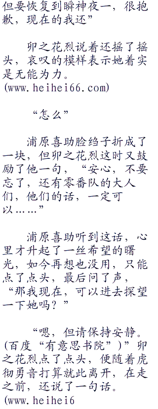 就在浦原喜助走到医疗队舍的第三层走廊最里部的病房时,却发现四番队的队长卯之花烈和副队长勇音两人正打开门走了出来。