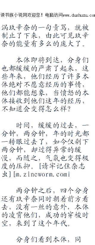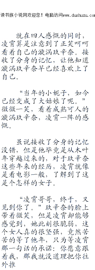 ;;;;当年,为了能尽快的插手木叶的事情,凌霄带领千手兄弟和漩涡水户穿梭时空,而当时因为漩涡玖辛奈还小的关系,凌霄便让其跟随着他们的分身生活,所以说实在的,漩涡玖辛奈才是真正经历了年生涯的人。