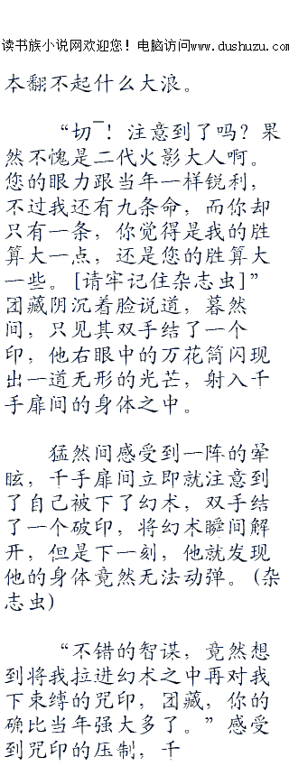 ;;;;“哼!!团藏呦,你似乎搞错了一点,那就是飞雷神之术的印记,只要一被锁定,就永远不会消失。你身上的飞雷神印记,正是当年我收你们为弟子的时候下的,只是我没想到,还有用到的一天。”冷冷的看着团藏说道,千手扉间道出了其中的缘由。
