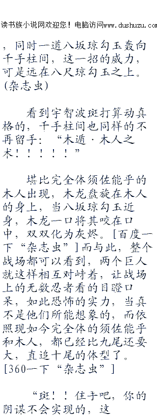 ;;;;“斑!!!看样子你已经忍不住了!!那么如你所愿!!!木遁·木龙之术!!!”成功加持了明神门的封印,千手柱间瞬间结印,庞大的木龙从他脚下升起,尾巴一甩,便将八尺琼勾玉打飞了出去。