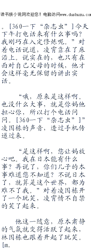 ;;;;听到这话,凌霄就知道一定是自己的老爸老妈有些日子没见着他,有些担心他。这个担心,自然不是担心凌霄会怎么样,而是担心凌霄会没有留下任何的消息就离开这个世界。