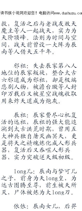 ;;;;潜long:前世为魔主之子,太古一战身死,转世成了东土十大修炼家族的long家第三子,为long舞的哥哥,其人天纵之子,小时就被修炼圣地飘渺峰长老收为门下,后来隐藏实力成为仙武学院学生,天生潇洒,象邻家大男孩一般。在参加四大学院比试时相遇辰南,在辰南等人还在三阶之时,其已经突破到了五阶绝世高手之列,并且为东土十大青年高手榜首。后因与辰南等人一起去探险死亡绝地,被魔主看重收为徒弟。六道破灭后,被混沌遗民困于古天迷城之中,后被辰南救出。最终,和魔主等人一同闯九重天灭天道。