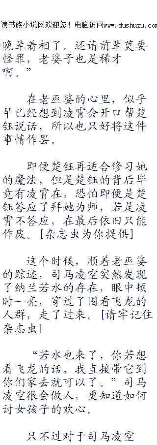 ;;;;老巫婆离开凌霄一行人的所在地,走到人群的前头,叫了起来:“钰儿,想飞可以和我学魔法啊,你看这样多轻松,何必骑人家的龙呢。”说完,老巫婆漂浮了起来,来到了场中央。