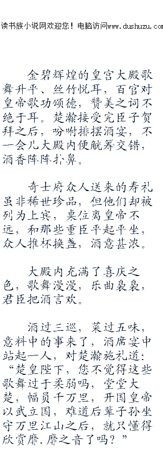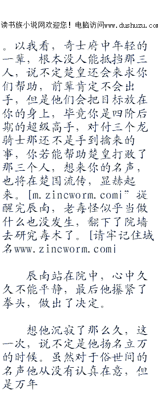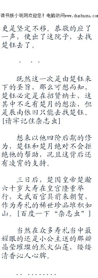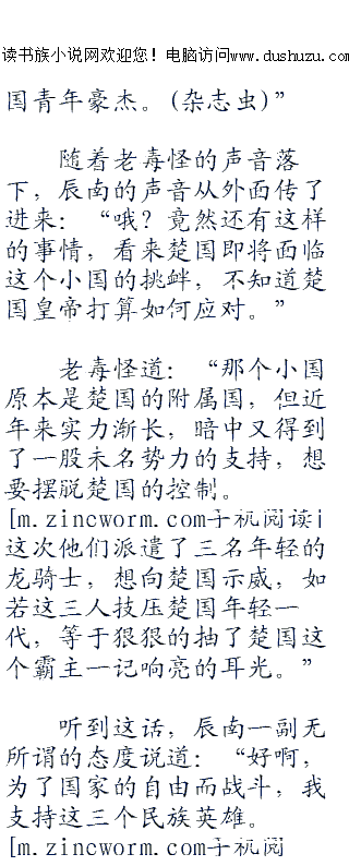 ;;;;“刚才楚国的小公主楚钰来传圣旨,三日之后皇上六十岁寿辰,邀请奇士府内的所有奇士参加。”屋外说话的人,赫然是老毒怪,只听他接着说道:“据说将会很热闹,一个小国派来了三个年轻的龙骑士,小道消息传说他们在宴会上将大显身手,大会楚