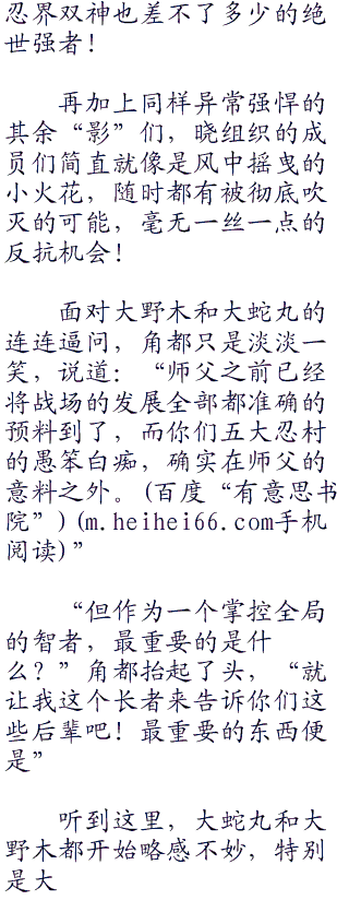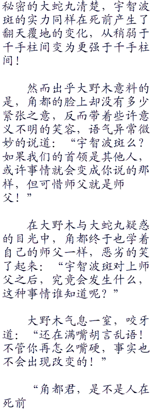 “没错,那毫无疑问正是宇智波斑本人了!”大野木大口的喘着粗气,“我年轻时曾与他交过手,绝对没错了你们输定了!”