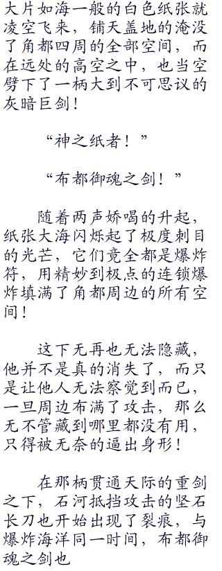 大蛇丸心念一动,无就已经借着无尘迷塞潜伏了起来,随时打算发动致命一击,而石河也在远处迅速的结完了印,召出一把坚石长刀要配合无一举解决掉角都。