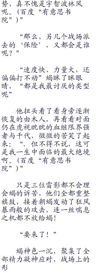 然而角都却仿若未觉一般,垂眼继续说道:“智者最重要的东西啊,就是能清楚在瞬息万变的战场上,随时都有可能出现不可想象之事,并懂得布置应对突发情况的保险!”