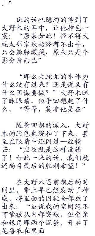 “大哥总是这么神神秘秘的啊”带土笑了笑,随后面色变冷,“不过或许,直接抓住大蛇丸会解决得更快一些呢。”