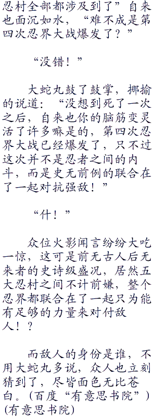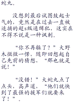 “说到宇智波斑的话,我想诸位不必担忧,”大蛇丸阴森森的笑道,“我已经将他秽土转生出来,派去对付宇智波林风了。”