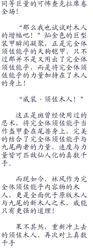 柱间看得瞠目结舌,完全就呆住了,那一模一样威风凛凛的巨大木人,简直就是他的翻版啊!