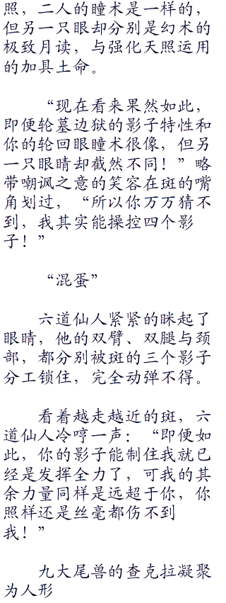 乌鸦眼中的万花筒写轮眼停止了旋转,慢慢的退化为了三勾轮写轮眼,鼬也稍微松了一口气。
