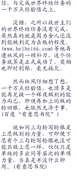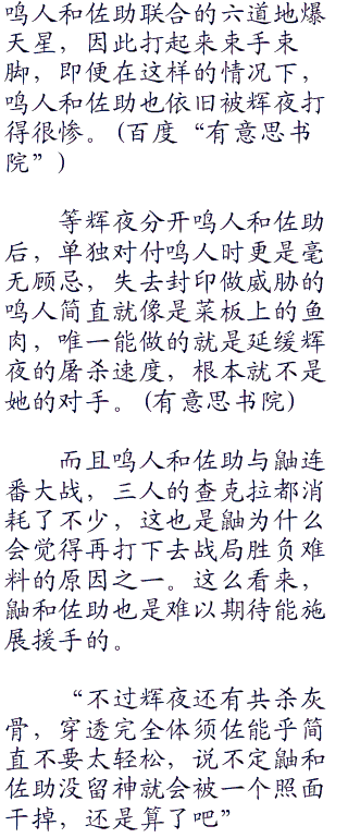 “斑现在伤痕累累,实力十不存一,应该是只能当围观群众了,”林风向斑的方向微微斜眼,又看向鸣人,“失去因陀罗力量的协助,少了封印威胁的鸣人,就算来了也照样是给我添乱,一点忙都帮不上”