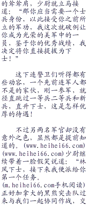 少尉跟身边的两人交头接耳商量了几句后,以非常低沉的声音对林风说道:“你是叫叫林风是吧?”