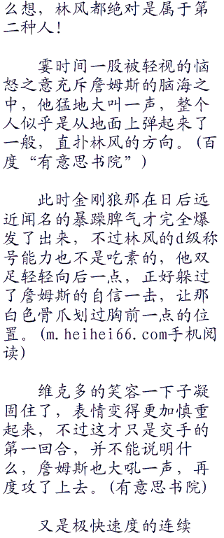 不过这种感情对维克多来说是不存在的,他唯恐天下不乱,冷笑道:“小詹,看来这家伙急需我们的教训啊。”