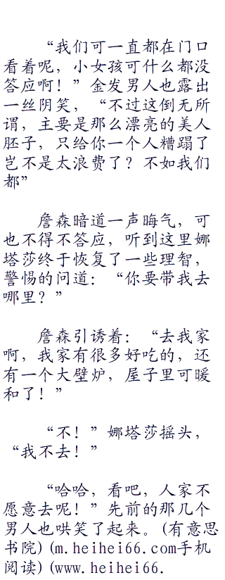 叫詹森的大汉嘿嘿一笑,舔着嘴唇说道:“这是她自己同意的,我可没强迫她。”