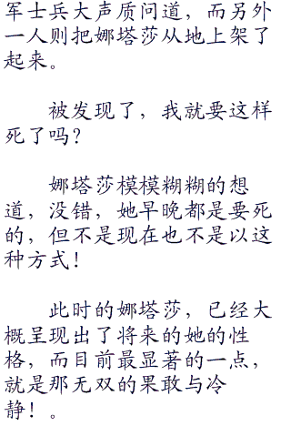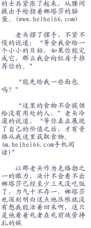 士兵脸上的神色似乎有些不满,大概是因为长期的营养不良的缘故,娜塔莎原本那少女饱满丰盈的身材如今已经瘦弱不堪,让他掺杂其中的私人**没能好好的得到满足。