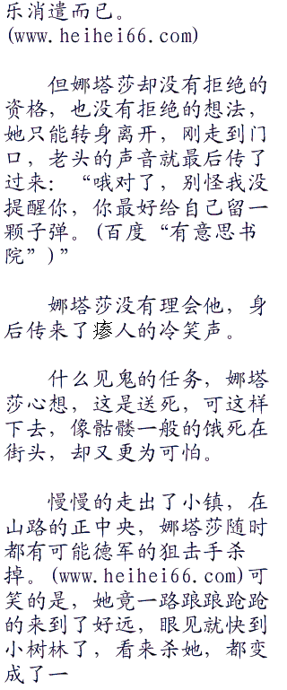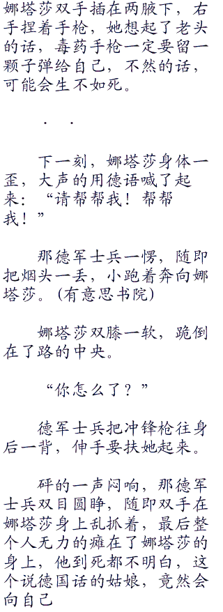 老头从巨大的办公桌走了出来,一张粗糙的手在娜塔莎的脸上摩挲了几下:“你就像是毒气室里的囚犯,肮脏、虚弱,伊凡早死了,这里没人会给你面包,滚吧!”