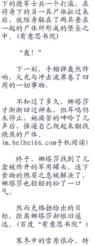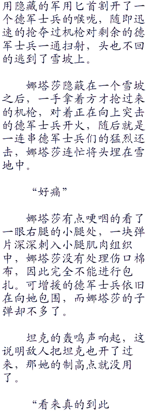 德军士兵一眼就看出“零零零”了那是什么,那正是娜塔莎从被她杀死的倒霉蛋身上搜出来的武器,这让德军士兵连声音都变了“手榴弹!!!快找遮蔽物!”