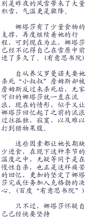 娜塔莎发育还不成熟,再加上三天未曾进食,身体可谓是极度的虚弱。