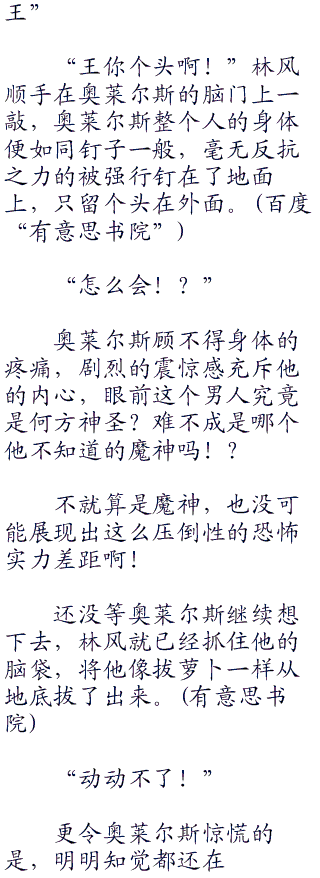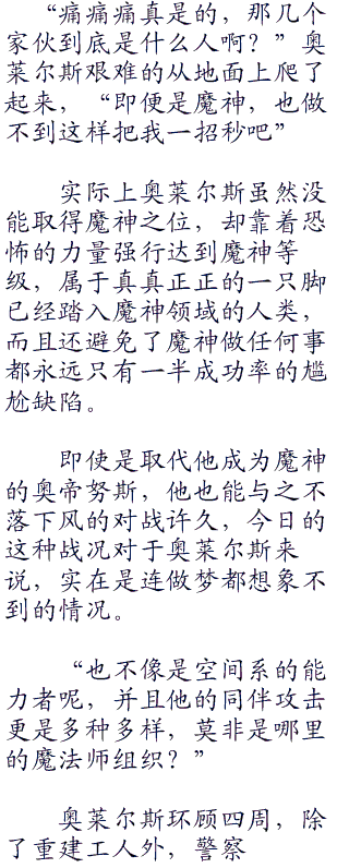 “可对于‘无法说明的能力’,却不能那样应对。”奥莱尔斯语气平静的慢慢说着,“这世上最可怕的就是,是用来自无法理解的地方、又无法说明的力量,令对手在想好对策之前就被击倒了。”