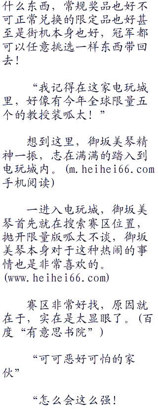 最最关键的是,冠军的奖品无比的丰厚,这奖品丰厚的内容倒不在于奖品价值的多少,否则以小土豪御坂美琴来说,也不会为此动心。