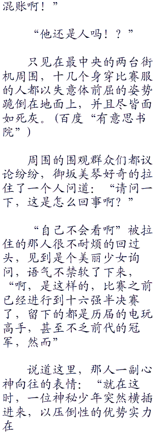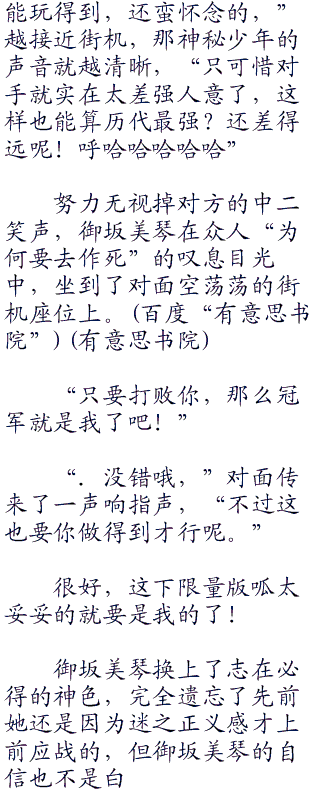 御坂美琴记得这貌似是个很久远的活动了,主打的也是这家电玩城的怀旧特色,每年到了这个时候,在电玩城内都会聚集学园都市不同学区的各大高手,热闹非凡,可以算得上是商店街的一大盛况了。